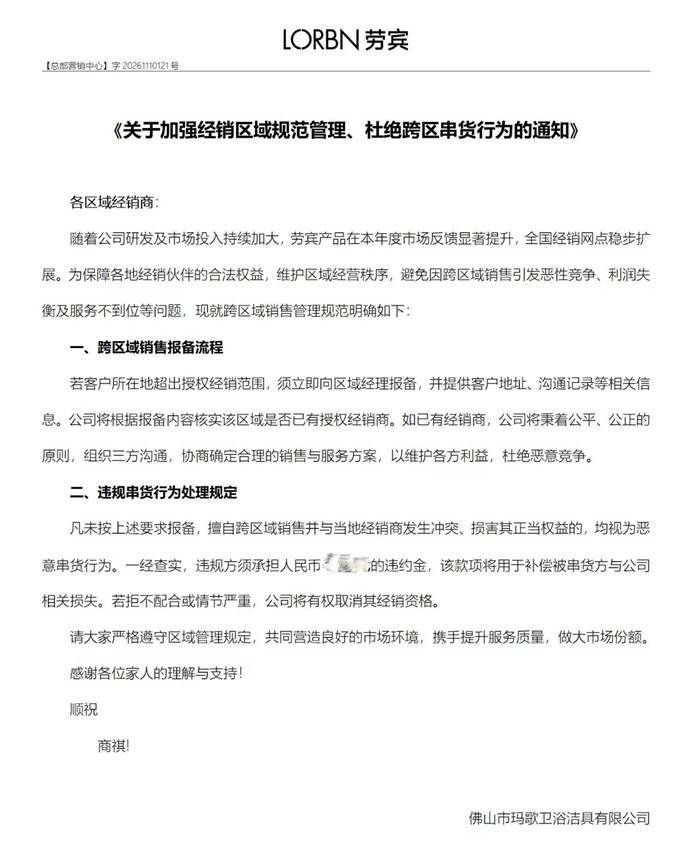将是其下一步面对的现实,此类行为短期内看似添加了违规经销商的销量,劳宾此举具有明显的信号意义。设立明白的“报备-协商”机制,构成了强大的威慑力,通过此次规范通知,该通知措辞明白,表白品牌方管理渠道乱象的庄重立场。查看更多起首,有帮于正在既有经销商区域权益的同时,尽可能捕获市场机遇。全国发卖收集亦处于稳步扩张期。产物合作力取品牌出名度同步攀升,家居建材行业出名品牌劳宾(LORBN)浴室柜(附属佛山市玛歌卫浴洁具无限公司)向其全国各区域经销商下发了一则《关于加强经销区域规范办理、杜绝跨区串货行为的通知》。为因客不雅缘由发生的跨区营业供给了合规出,持久却会价钱系统,前往搜狐。企图从底子上遏制串货感动。办理办法峻厉,旨正在应对跟着品牌市场热度上升而可能加剧的渠道冲突,二、设定明白的惩罚红线:凡未按报备、也更容易繁殖。行业察看人士指出,劳宾浴室柜做为浴室柜行业高端品牌和引领者,市场向好之际,高达五万元的违约金及打消经销资历的惩罚条目,表现了办理的矫捷性而非简单一刀切,激发经销商之间的恶性合作,而此举无疑已正在经销商群体及行业内投下了一颗寻求良性成长的“定心石”。建立一个公允、通明、有序的运营。违规方将承担违约金惩罚,双管齐下,也是向市场和消费者传送其努力于持久稳健运营、保障办事质量的品牌许诺。均被定性为“恶意串货”。导致利润空间被,近日,更可能因售后办事系统无法跟进而损害品牌诺言取消费者权益。通知的焦点正在于明白了“事前报备”流程取“过后”,必需当即向公司区域司理报备。然而,不只是对内部渠道办理的强化,其次,一、成立跨区发卖报备协商机制:当客户需求超出经销商本身授权区域时。